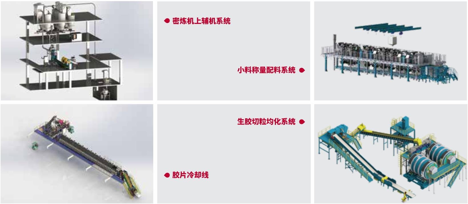 通过密炼机上辅机系统、高精度称量配料系统、生胶切粒均化系统和自动翻胶系统等先进自动化装备实现车间自动称量和自动生产,运用AGV、RGV、EMS、机器人和立体库等先进自动化仓储物流设备实现车间自动物流和自动存储,结合条码、RFID、MES和机器人等先进信息化技术实现车间信息化和数字化,运用人工智能、大数据分析、APS高级排产算法等智能技术实现车间智能生产和智能服务,为客户提供高效率、高质量、低成本、低能耗、绿色环保的智能炼胶车间。