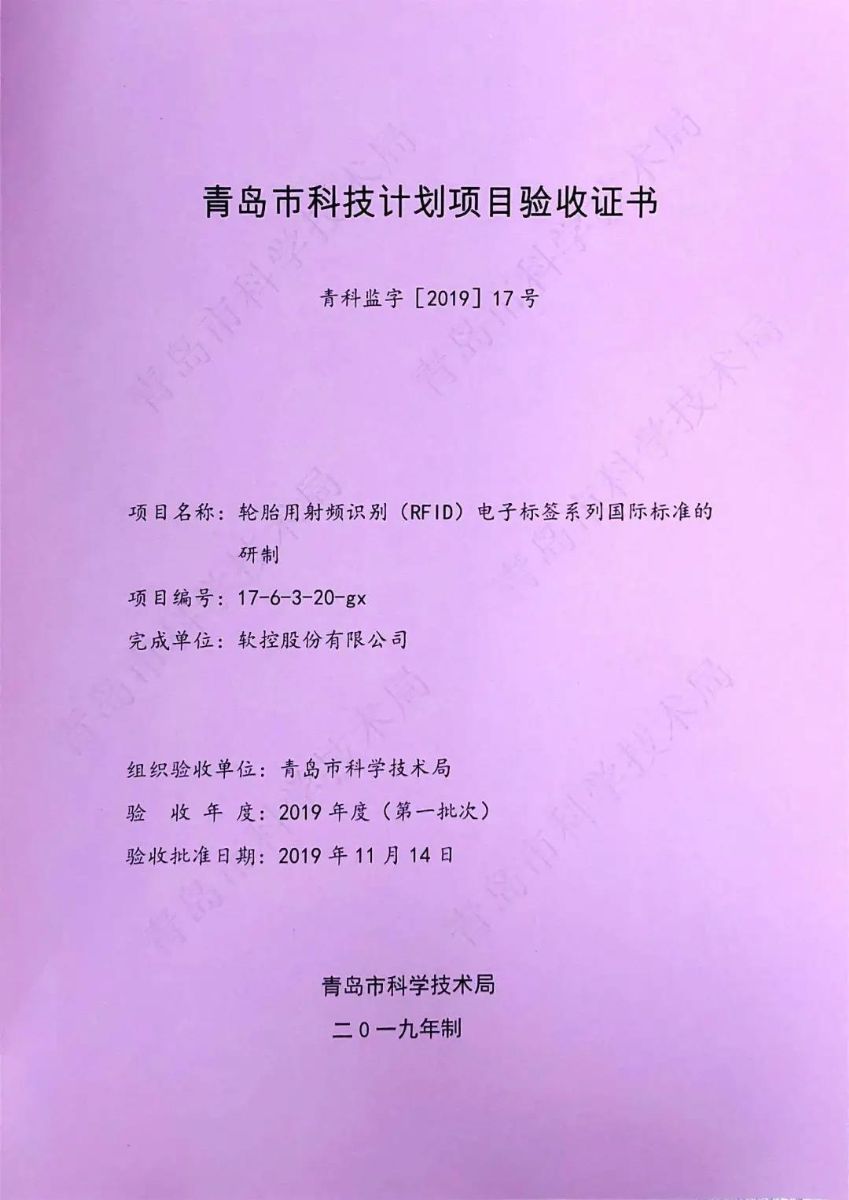 近日,银河集团(galaxy)承担的2017年青岛市民生科技计划项目“轮胎用射频识别(RFID)电子标签系列国际标准的研制”顺利完成全部验收工作,青岛市科学技术局下发青岛市科技计划项目验收证书。